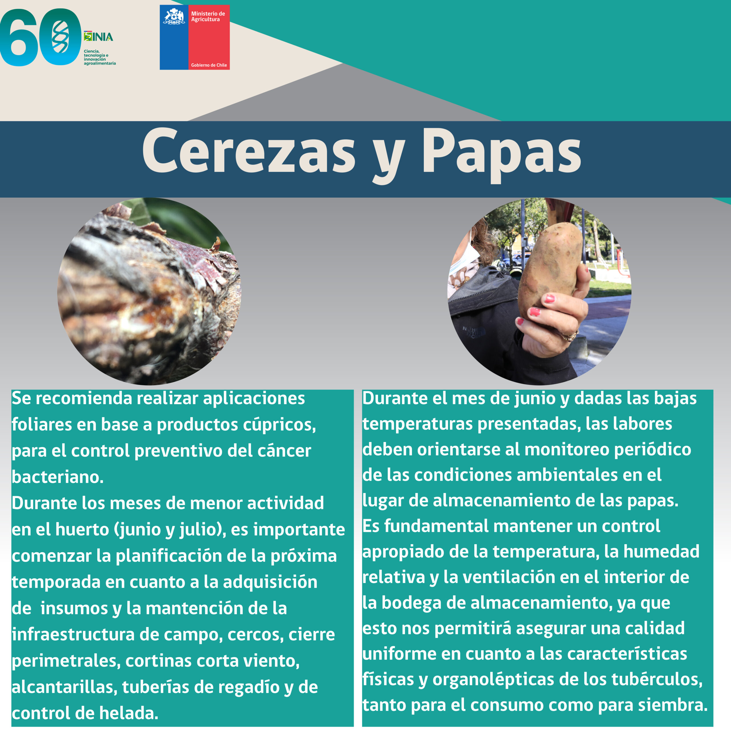 Cerezas: Se recomienda la aplicación de tratamientos preventivos para el cáncer bacteriano y la planificación de la próxima temporada de cultivo, incluyendo el mantenimiento de infraestructuras y la adquisición de insumos.