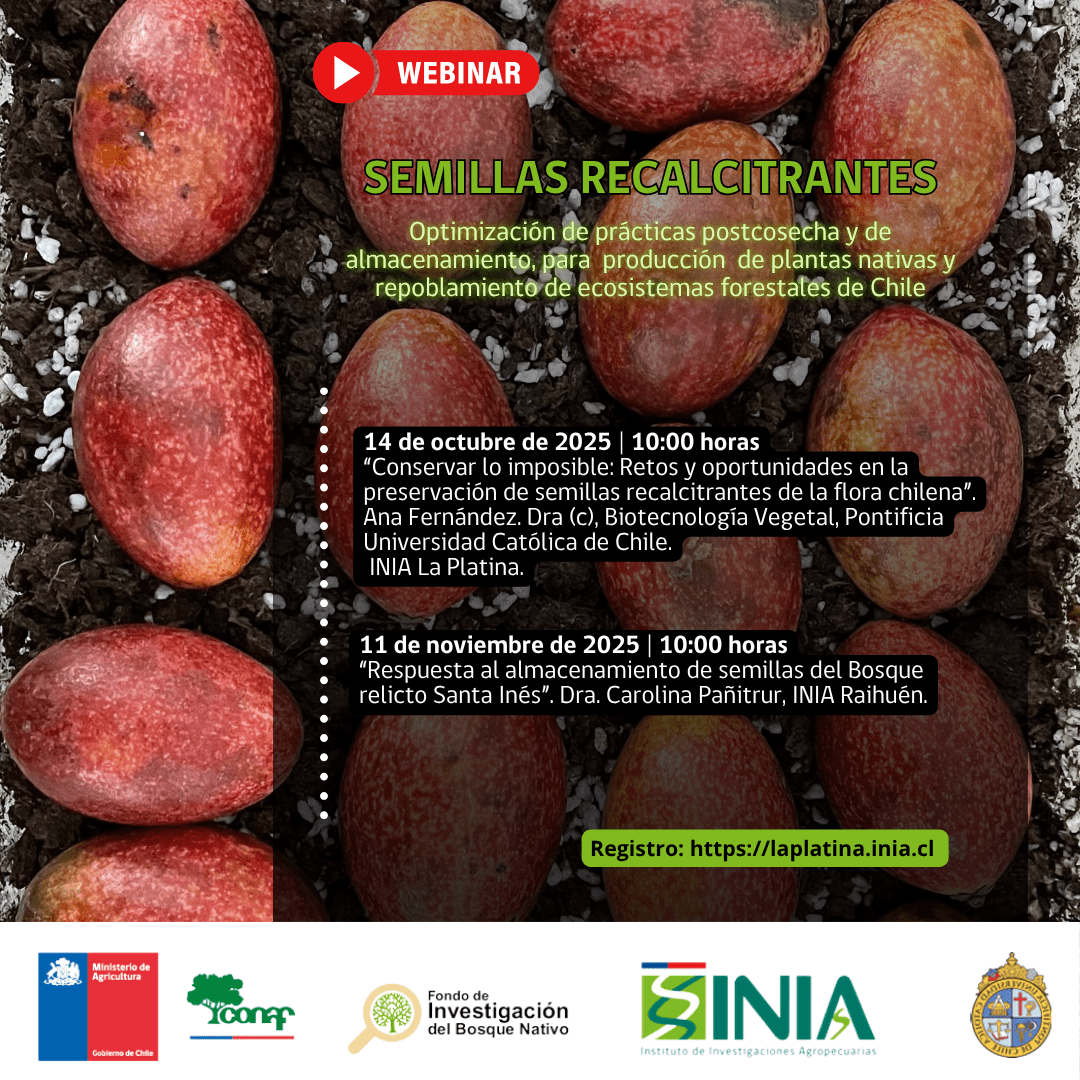 Santiago, octubre de 2025.- Con el objetivo de fortalecer el conocimiento y las prácticas asociadas a la conservación de especies nativas del país, INIA La Platina está realizando un ciclo de webinars sobre semillas de almacenamiento no convencional, bajo el título “Optimización de prácticas postcosecha y de almacenamiento de semillas recalcitrantes para producción de plantas nativas y repoblamiento de ecosistemas forestales de Chile”.