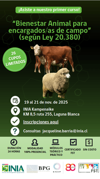 Punta Arenas, noviembre de 2025.- Con el propósito de fortalecer las capacidades técnicas del sector ganadero regional, el Instituto de Investigaciones Agropecuarias (INIA Kampenaike) realizará su primer curso de capacitación en “Bienestar Animal para encargados/as de campo (según Ley 20.380)”, orientado a entregar conocimientos y competencias clave para cumplir con los requisitos establecidos por el Servicio Agrícola y Ganadero (SAG).