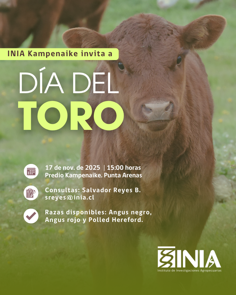 Punta Arenas, noviembre de 2025.- El Instituto de Investigaciones Agropecuarias (INIA) Kampenaike invita a ganaderos, productores y público interesado a participar en una nueva edición del “Día del Toro”, encuentro técnico que se realizará el 17 de noviembre a las 15:00 horas en el predio experimental de INIA Kampenaike, ubicado en Punta Arenas.