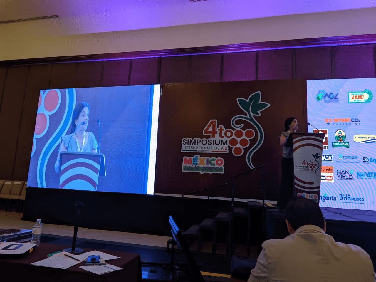 Durante su presentación, titulada “El (nuevo) problema del color”, la especialista del programa de mejoramiento genético analizó los procesos fisiológicos y las prácticas de manejo que inciden en el desarrollo del color en uva de mesa, con énfasis en el efecto de las altas temperaturas, una condición determinante para regiones productivas como Sonora. La exposición se sustentó en resultados y experiencias generadas a partir del trabajo de investigación que se desarrolla en INIA La Platina (Santiago), orientado a comprender este fenómeno y a evaluar alternativas de manejo en escenarios de estrés térmico.